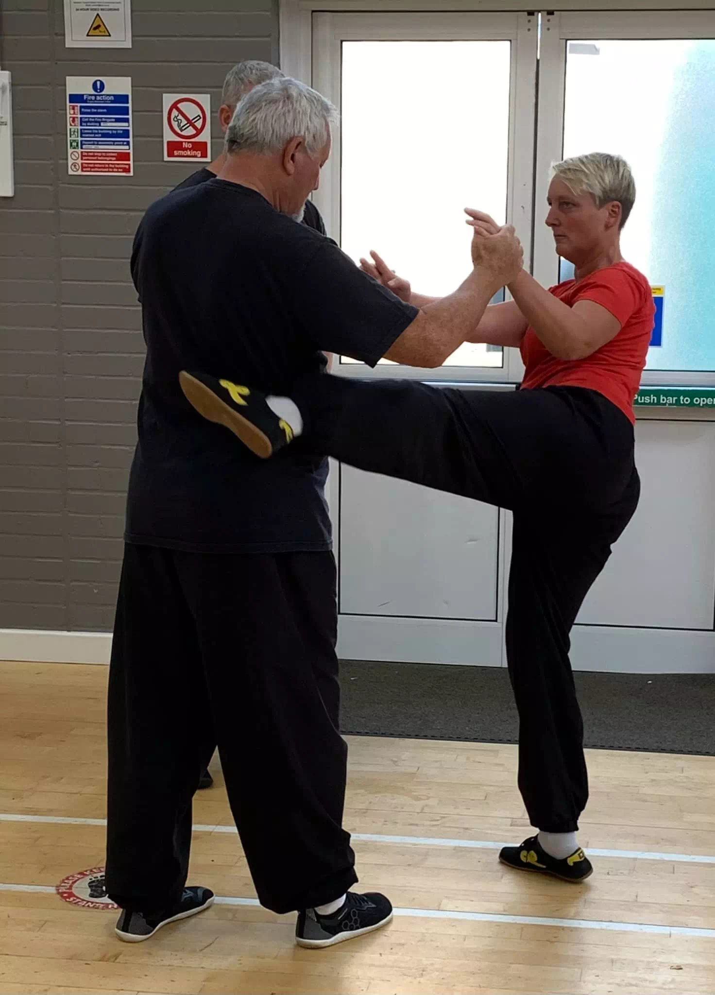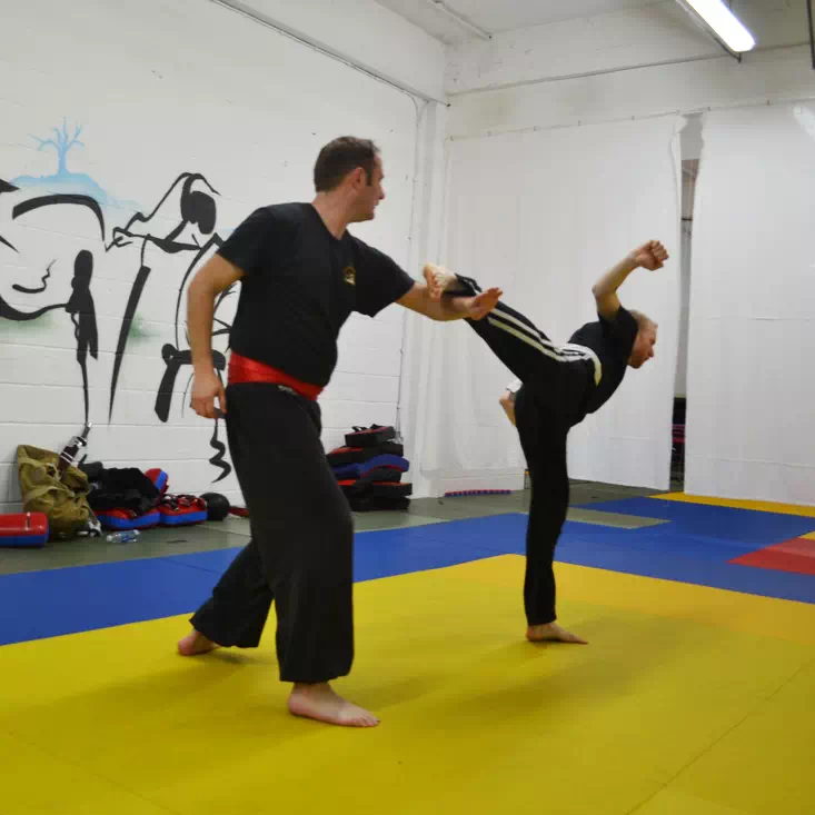 Une variété de parades avec les mains, les bras, les pieds sont apprises pour faire face aux coups de pieds.