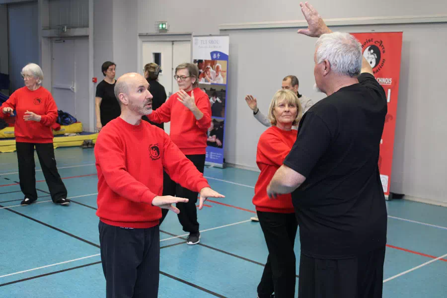Le Dimanche , 24 personnes furent réunies autour des mêmes concepts que la veille. Pratique d’un exercice de Kai Men , travail du centre (yao) , travail du pli linguinal de la hanche (kua), ouverture des épaules . Transfert de cette sensibilisation à travers de la forme à mains nues et pour terminer un travail des Mains collées intégrant les éléments essentiels de la Forme.
